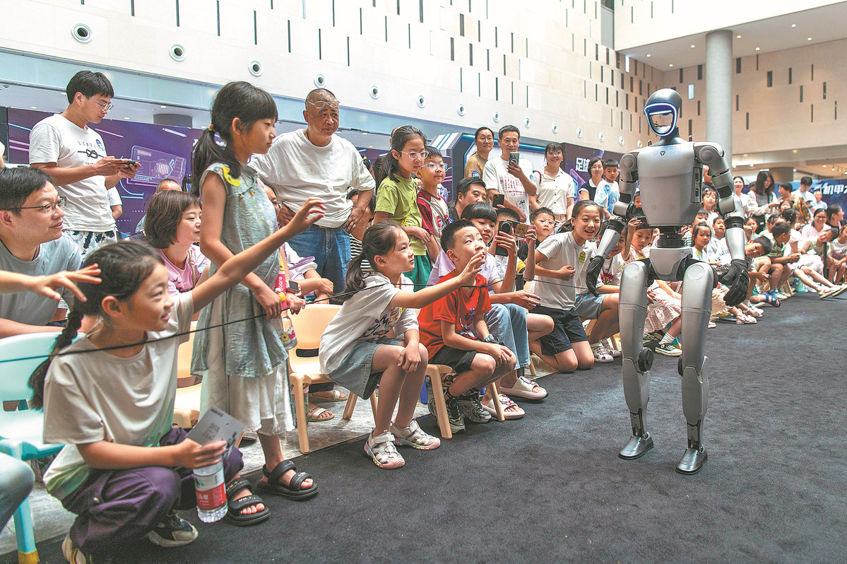 Visitors interact with a Unitree humanoid robot at a sci-tech museum in Jinhua, Zhejiang province, on July 27. HU XIAOFEI/FOR CHINA DAILY